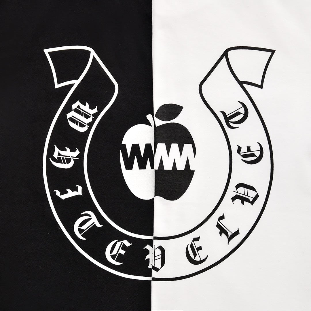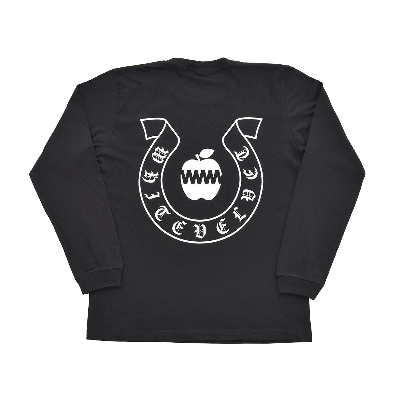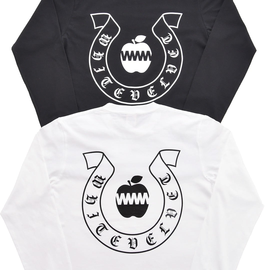 人気の毒林檎LOGOと馬の蹄鉄をモチーフ としたロンTの発売です。 バックプリントのBlackLetterが目を引く アイテムとなっております。 FRONTはシンプルに無地で。