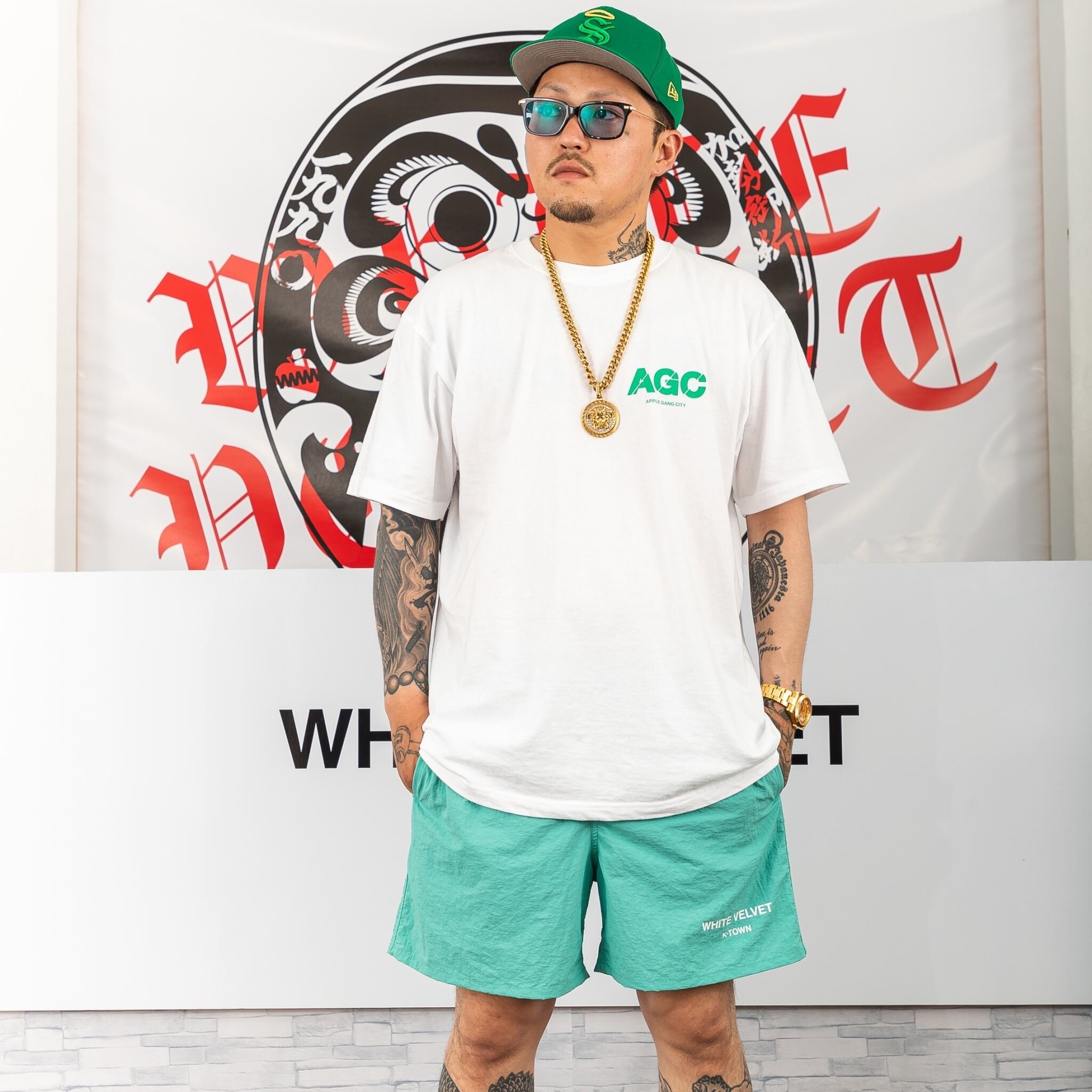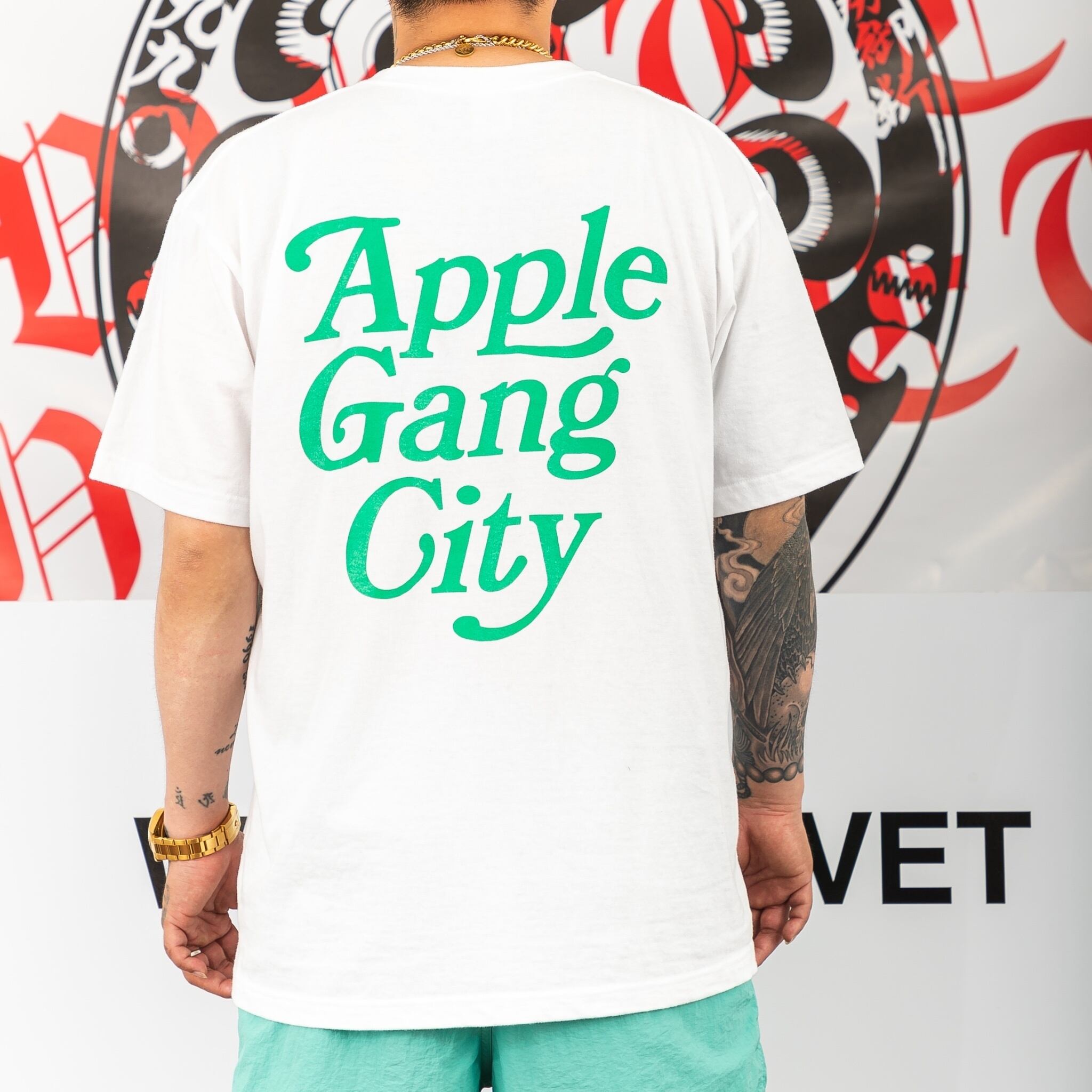 APPLEGANGCITY今夏大人気のメインロゴ。 先行発売でもダントツの人気商品です。 バックにはアメリカのショッピングバックをイメージしたデザインが目を引きインパクト抜群。 完売必須。 サマースウェットパンツとセットアップでもお楽しみいただけます。